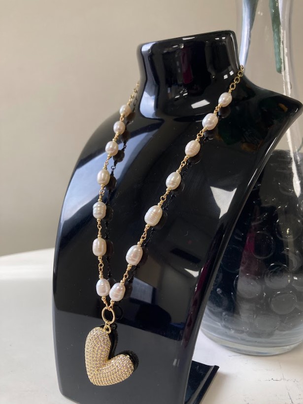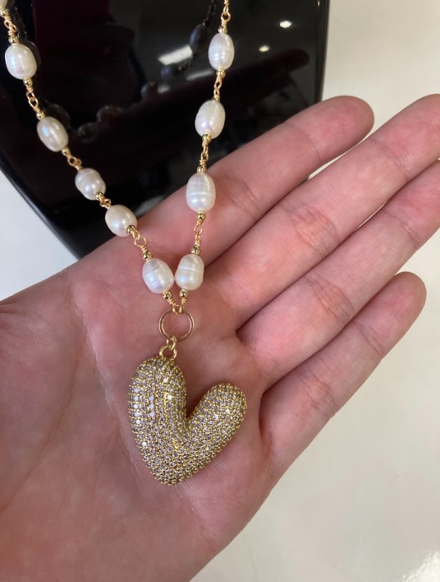 Collar Perla de rio y Baño de oro 50 cm Corazón Brillante (Perlas Blanca)